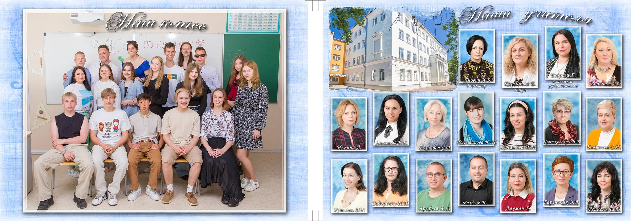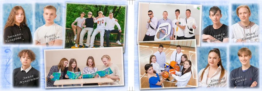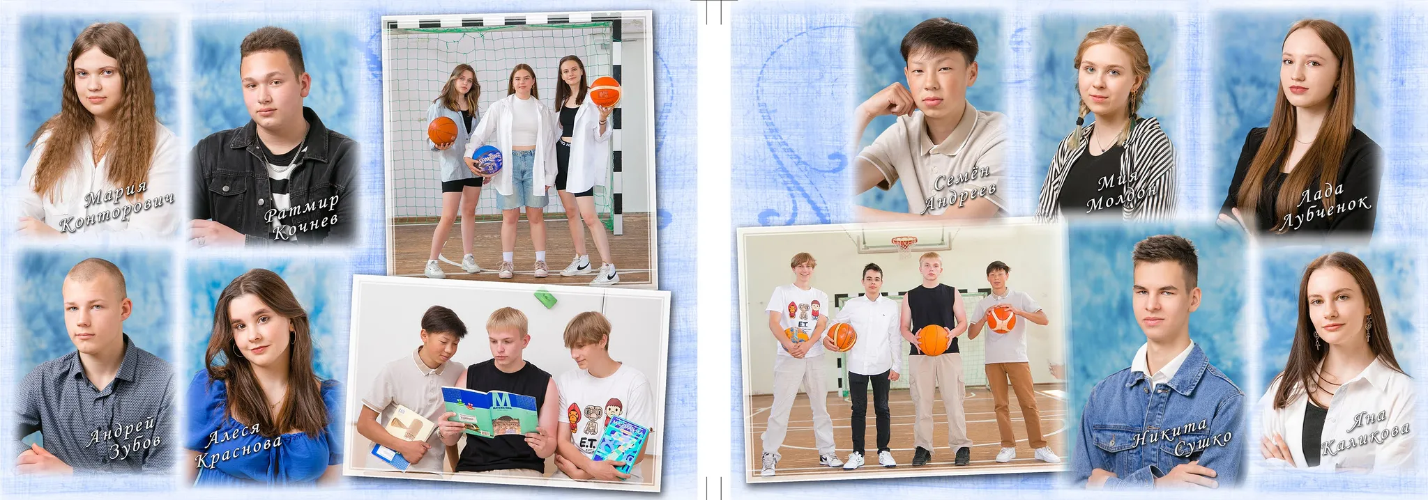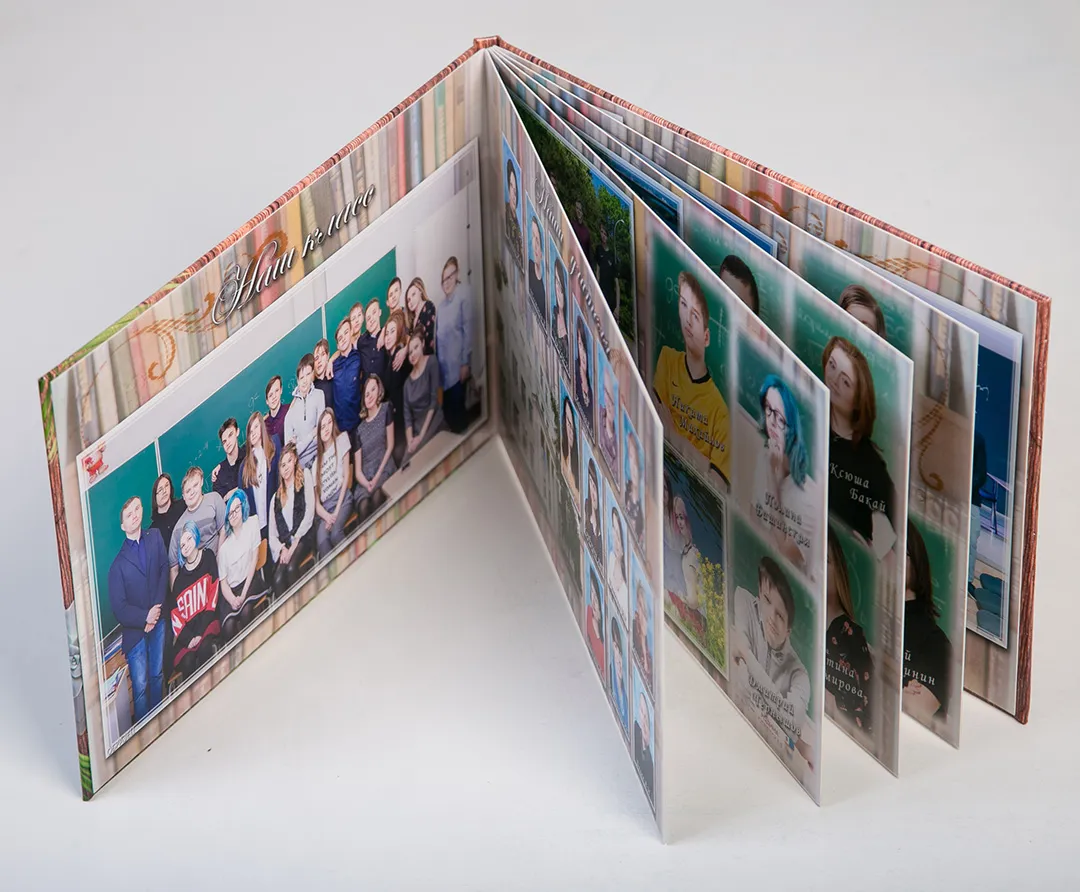 Внутри книги 10 страниц: общее фото класса, страницы с портретами учеников класса, страница с портретами учителей, много места для групповых фото. Портрет ученика -- на передней обложке